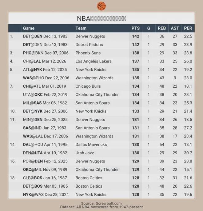 没有加时赛的情况下,首发五人合砍137分排名历史第一。即便算上加时赛,137分也能排历史第四。前三分别是:1、1983年掘金首发142分(3加时);2、1983年活塞首发142分(3加时);3、2006年太阳首发合计138分(1加时)。