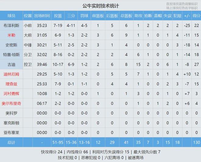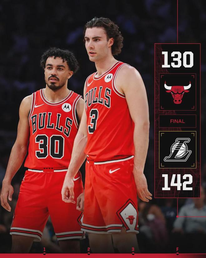 公牛这边,吉迪27分8板15助2断、布泽利斯22分6板2断2帽。公牛缺兵少将,第四节一直在追分,湖人赢得并没有那么轻松。河村勇辉替补出战10分钟,2投1中拿到3分3助攻。公牛篮板跟湖人打平,助攻还多3个,但15次失误太多了。