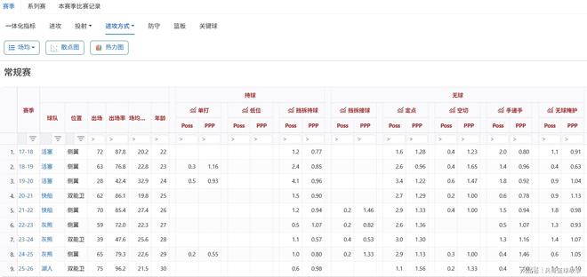 在活塞三个赛季,肯纳德用的最多的得分方式是单打和挡拆持球,那个时候他也投定点三分,但有/无球得分占比是五五开。离开活塞肯纳德5个赛季换了3支球队,但他从未放弃持球进攻,只不过定点得分占比逐步提升。这才给人一种“肯纳德是投手”的错觉。