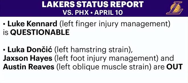 北京时间4月11日,洛杉矶湖人队常规赛还剩两场比赛,这两场对决对球队在西部季后赛开始前的排位至关重要。在今日主场对阵太阳队的比赛前,神射手后卫肯纳德出现在湖人的伤病名单上,对这支传统豪门而言显然是个令人担忧的消息。