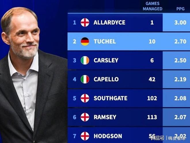 8场预选赛,加上2场非正式比赛,图赫尔仅在友谊赛负于塞内加尔,也是唯一有失球的比赛。统计表明,10场9胜,场均2.7分,是英格兰所有主帅中第二高的,仅次于只带队一场,就因为丑闻而下课的阿勒代斯。其实,前任卡斯利场均得分也能排在第三名,也不算太差,随后包括卡佩罗、索斯盖特等熟悉的名字。