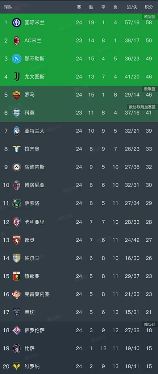 意甲最新积分榜