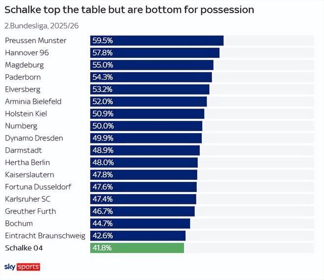 不过,与足坛诸多知名教练不同的是,当穆斯利奇描绘球队愿景时,他脑海中浮现的是球队“无球状态”的画面。沙尔克04的积分排名榜首,但控球率却垫底。