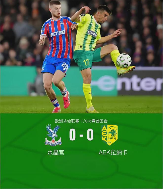 当终场哨声在塞尔赫斯特公园球场刺耳地响起,比分牌上的“0-0”显得格外扎眼。看台上没有掌声,只有回荡不息的嘘声——这不仅是针对今晚的对手AEK拉纳卡,更是送给自家那身价数亿、却仿佛迷途的英超“雄鹰”。