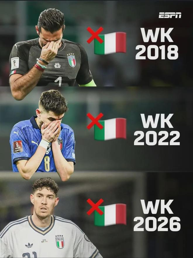 2018年,意大利附加赛不敌瑞典;2022年,附加赛被北马其顿绝杀;2026年,附加赛点球负于波黑。三次附加赛,三次倒在终点线前。这不是魔咒,是系统性崩塌的必然结果。