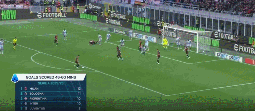第32分钟,米兰错失了扳平比分的绝佳良机,莱奥门前抢点射门却离谱变成解围。